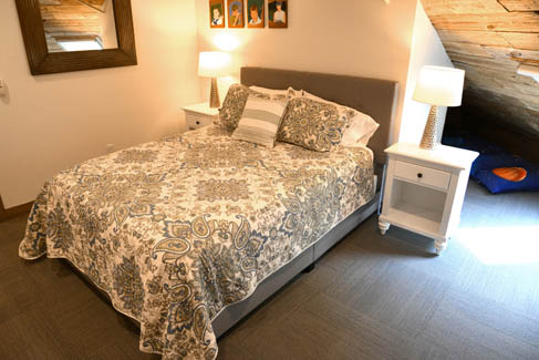 3rd floor queen bedroom with dock board ceieling